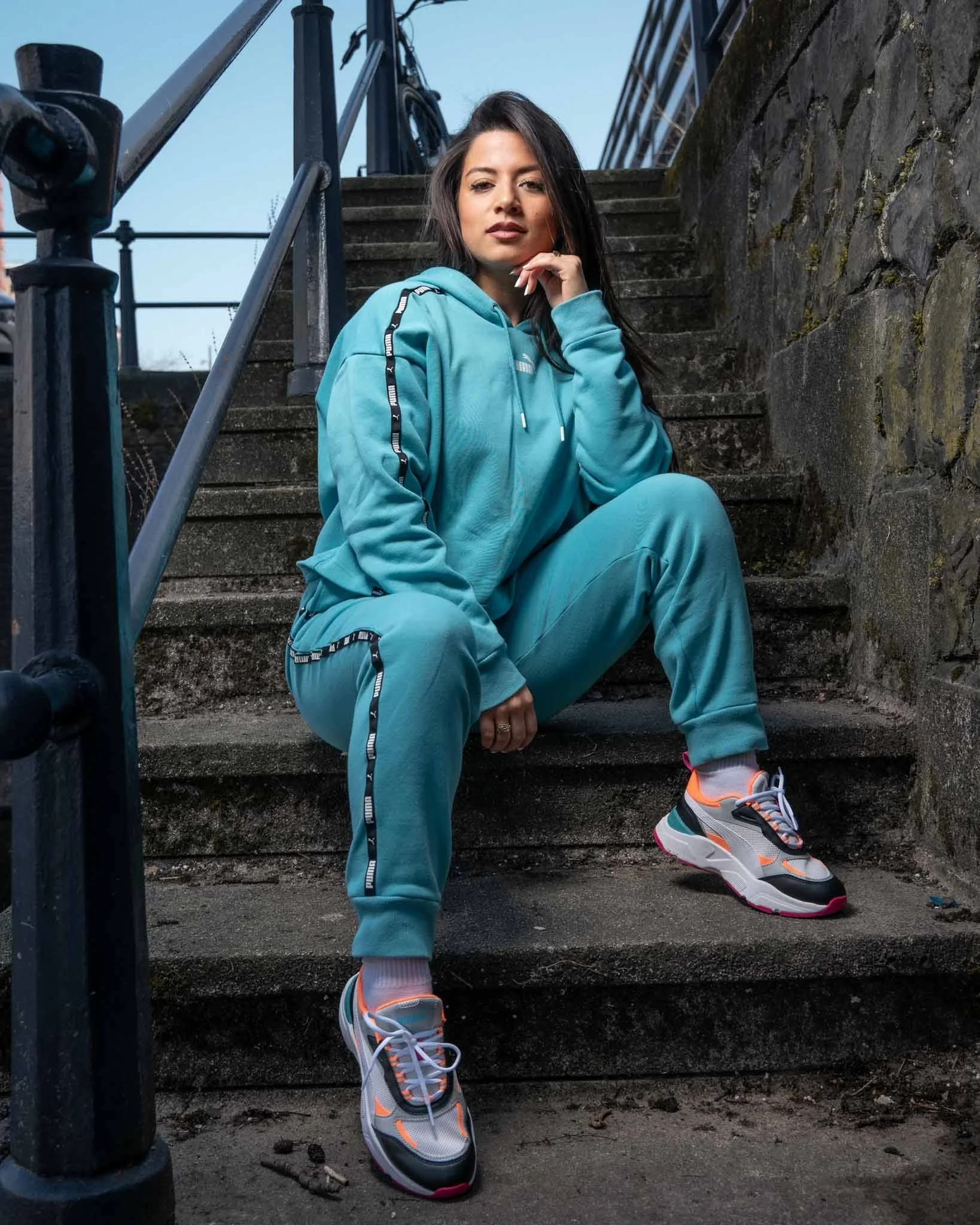 Vrouw in een turquoise sportoutfit zittend op trappen voor een stenen muur, draag sneakers en kijkt recht in de camera.